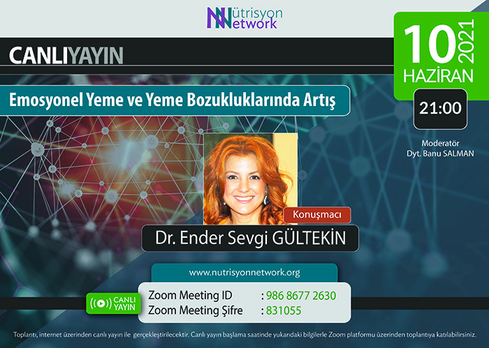 Dr. Ender Sevgi Gültekin'in konuşmacı olarak katılacağı ‘’Emosyonel Yeme ve Yeme Bozukluklarında Artış’’ konulu canlı yayın toplantısında, zaman elverdiği kadar katılımcıların da görüş ve düşüncelerini paylaşmasına olanak sağlanacaktır.